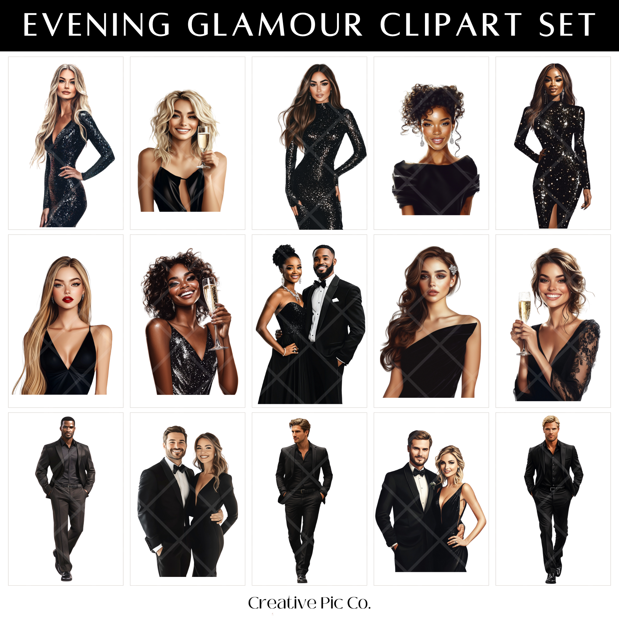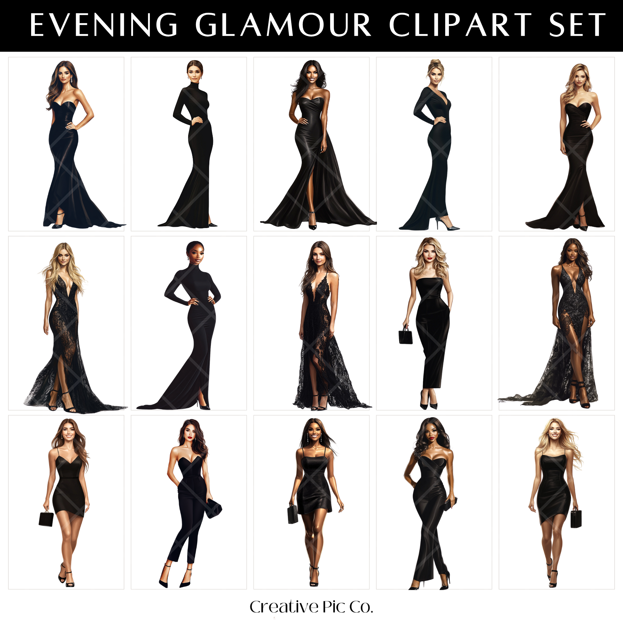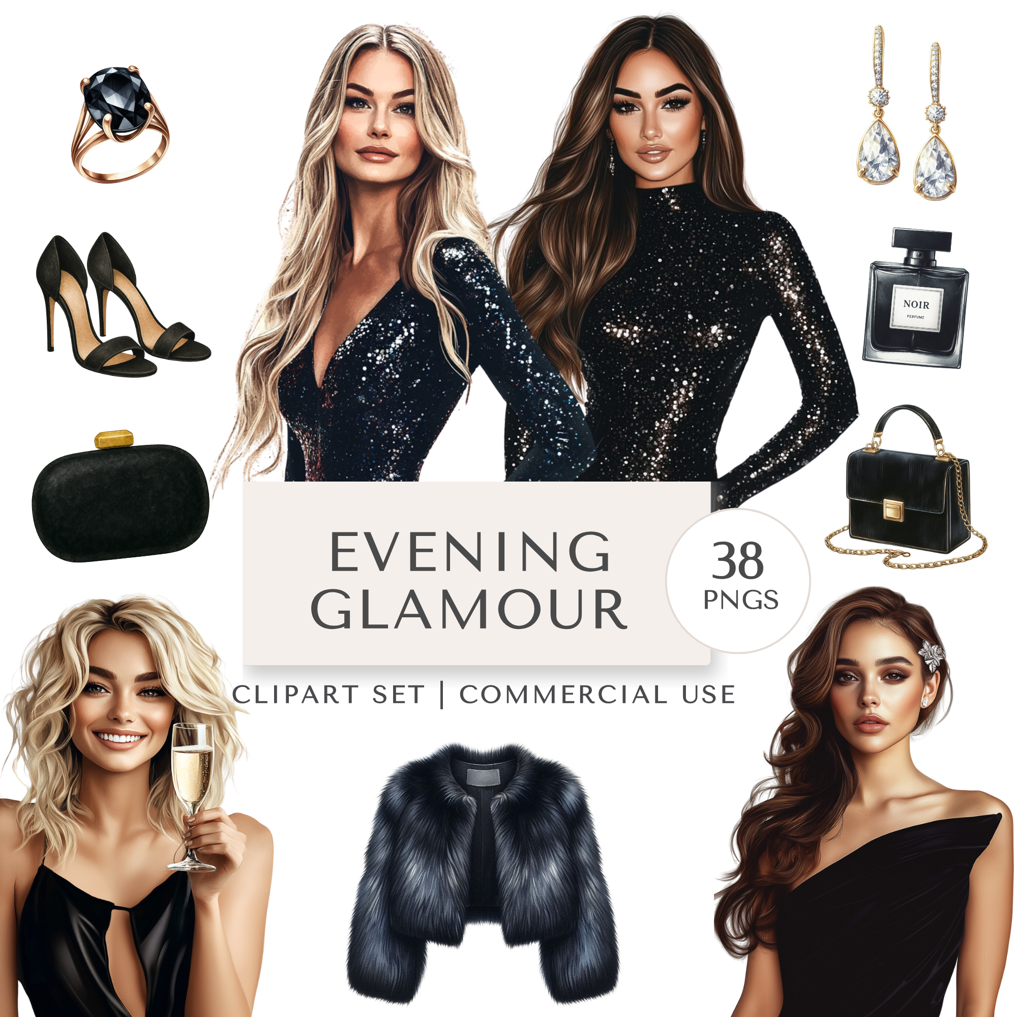Add a touch of sophistication to your creative projects with the Evening Glamour Clipart Set. This luxurious collection of 38 PNGs features glamorous women in evening gowns, black tie fashion, sparkling jewellery, high heels, and statement accessories