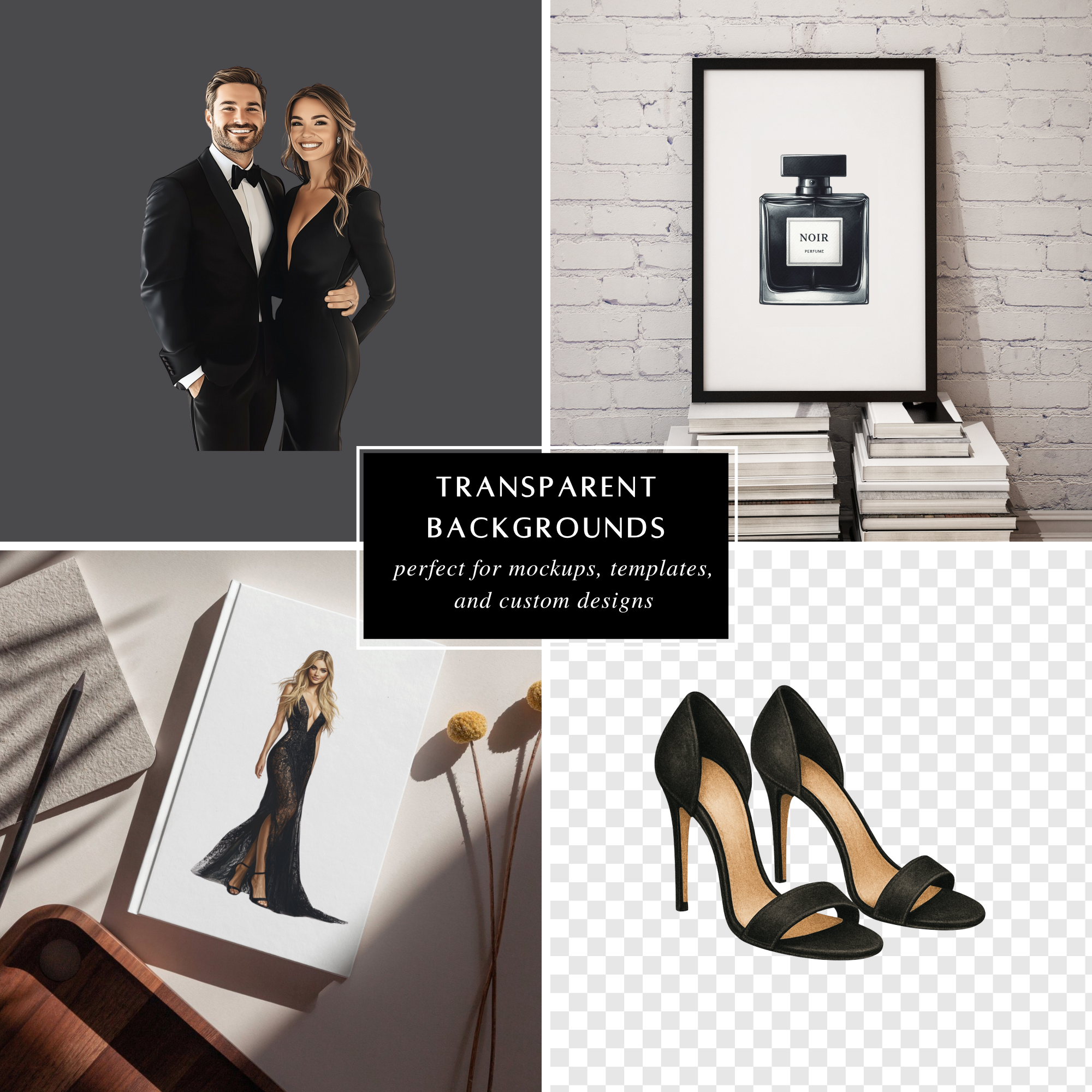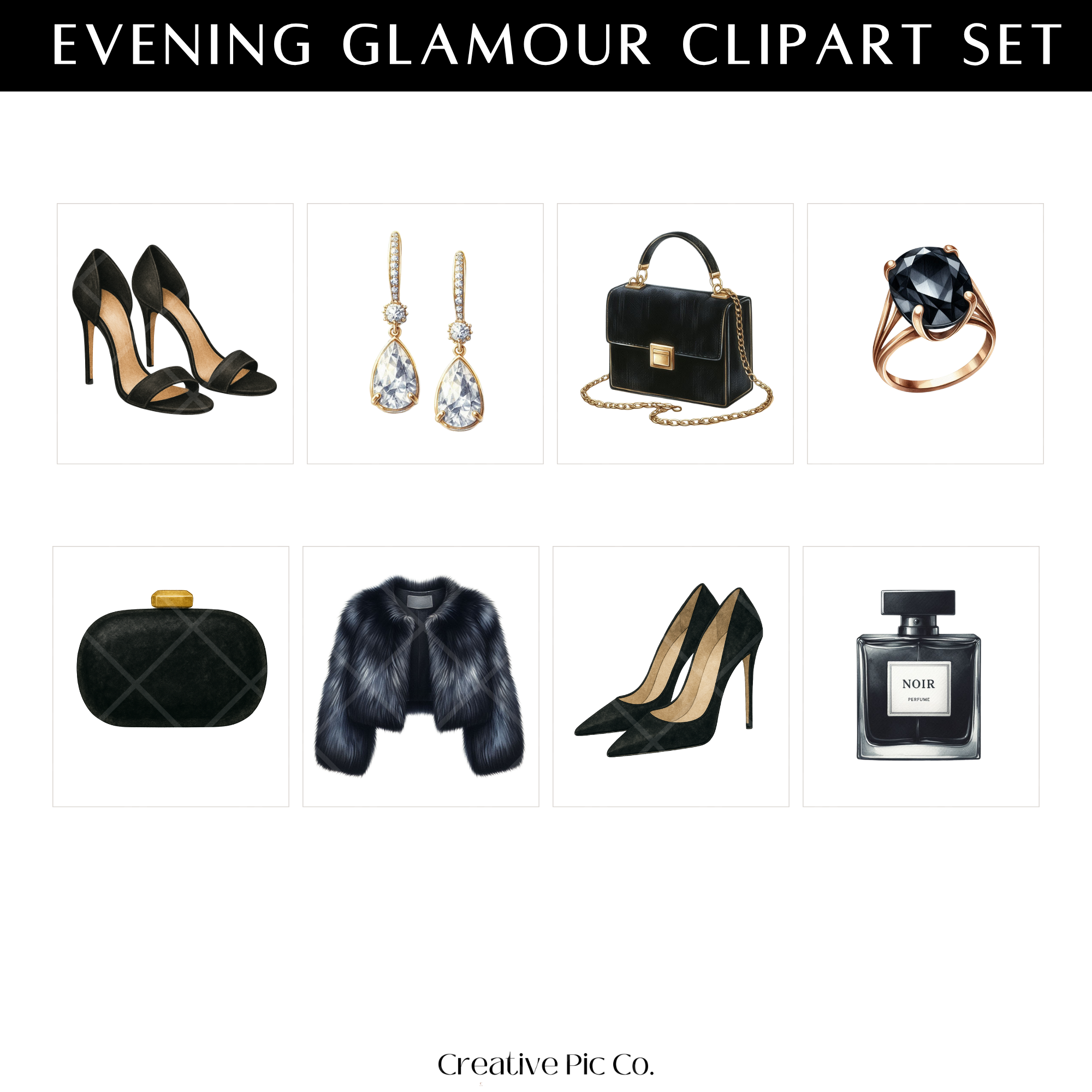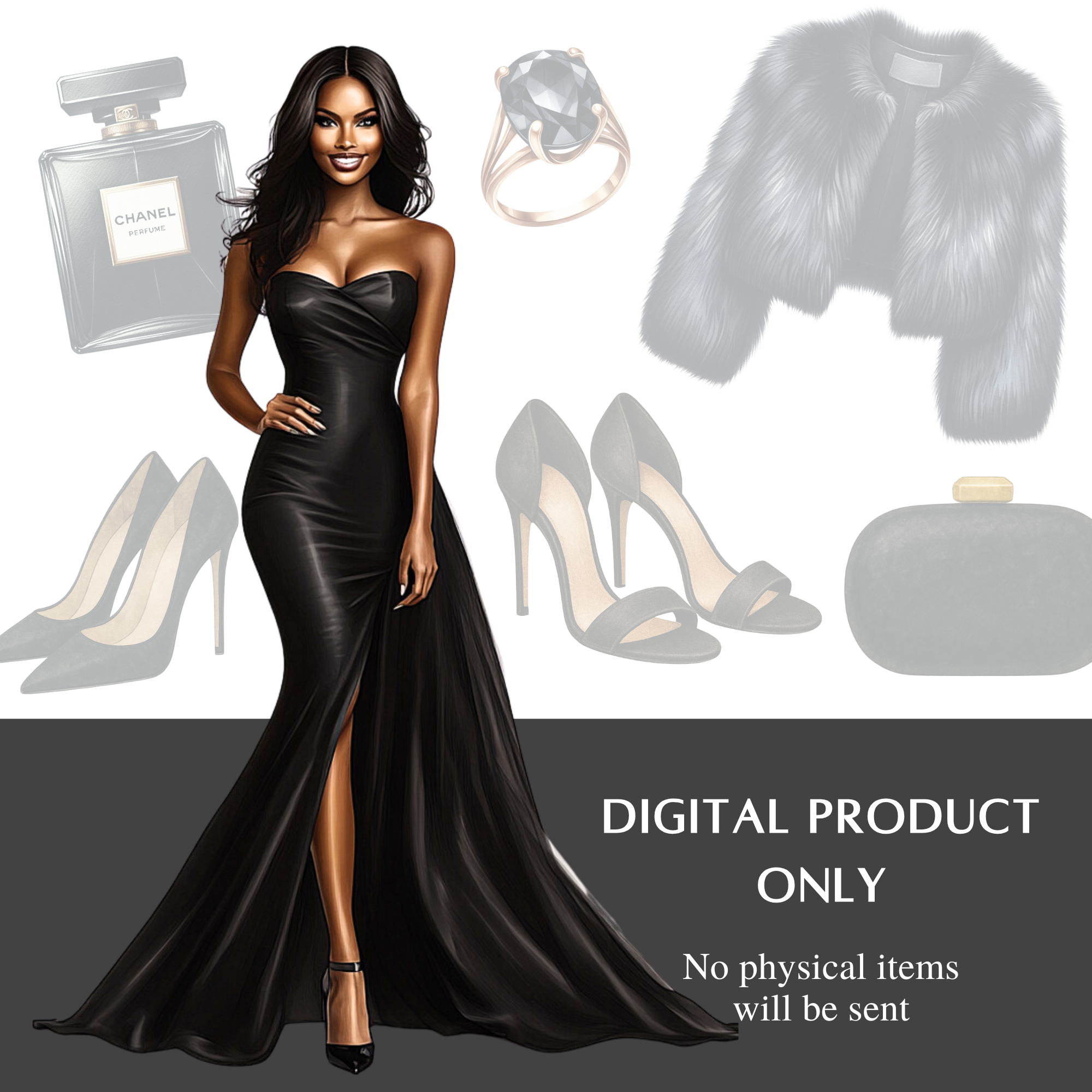 Add a touch of sophistication to your creative projects with the Evening Glamour Clipart Set. This luxurious collection of 38 PNGs features glamorous women in evening gowns, black tie fashion, sparkling jewellery, high heels, and statement accessories
