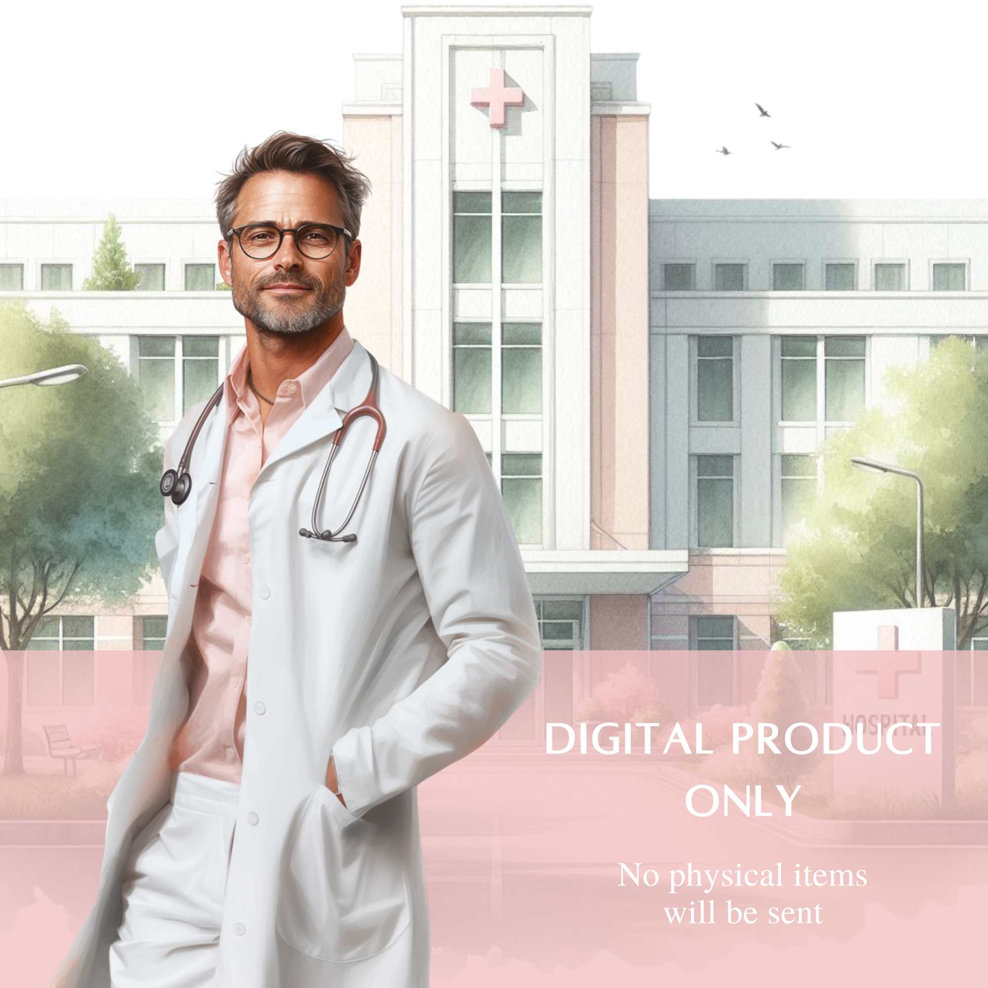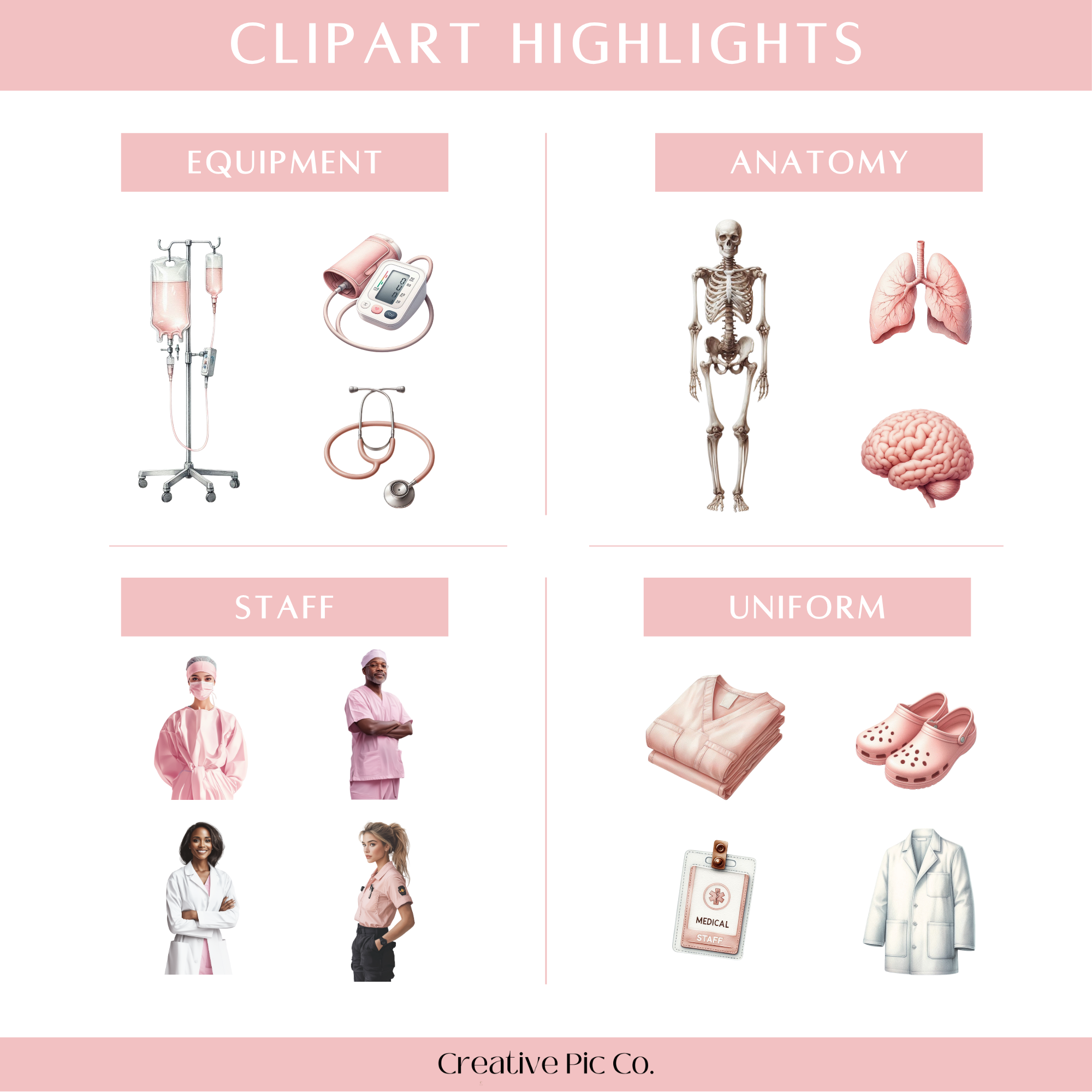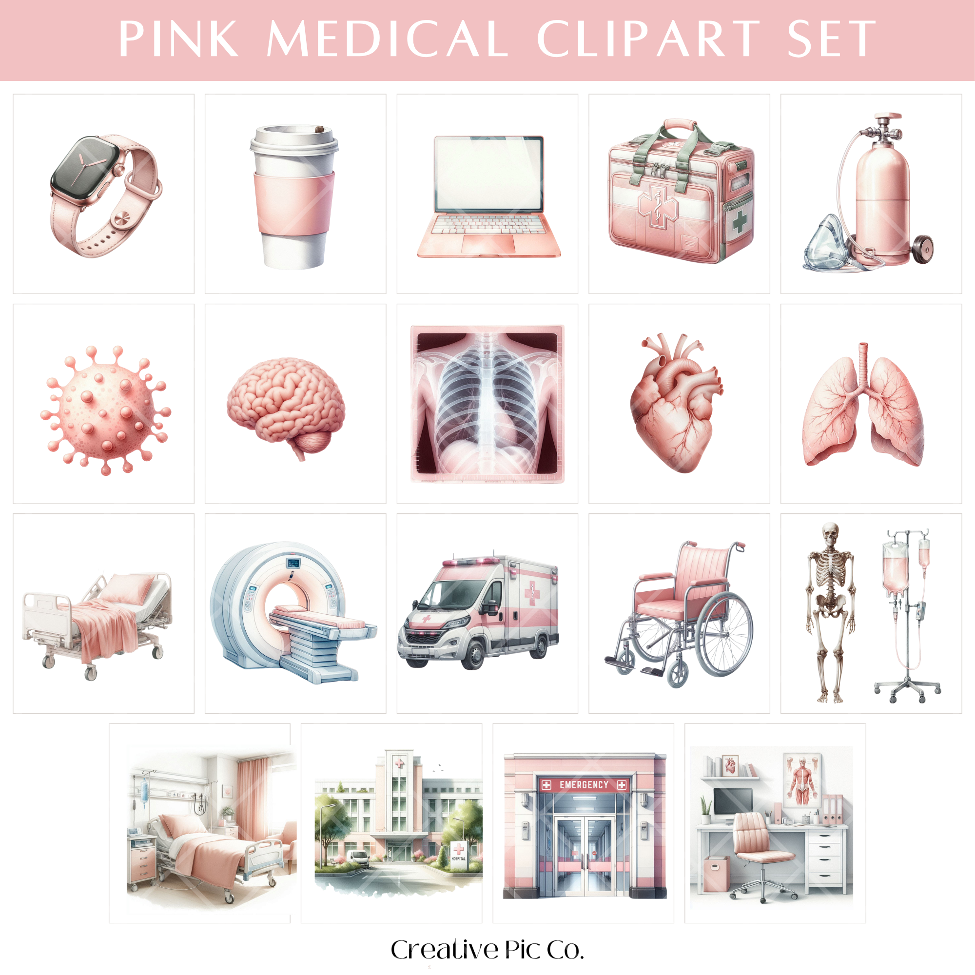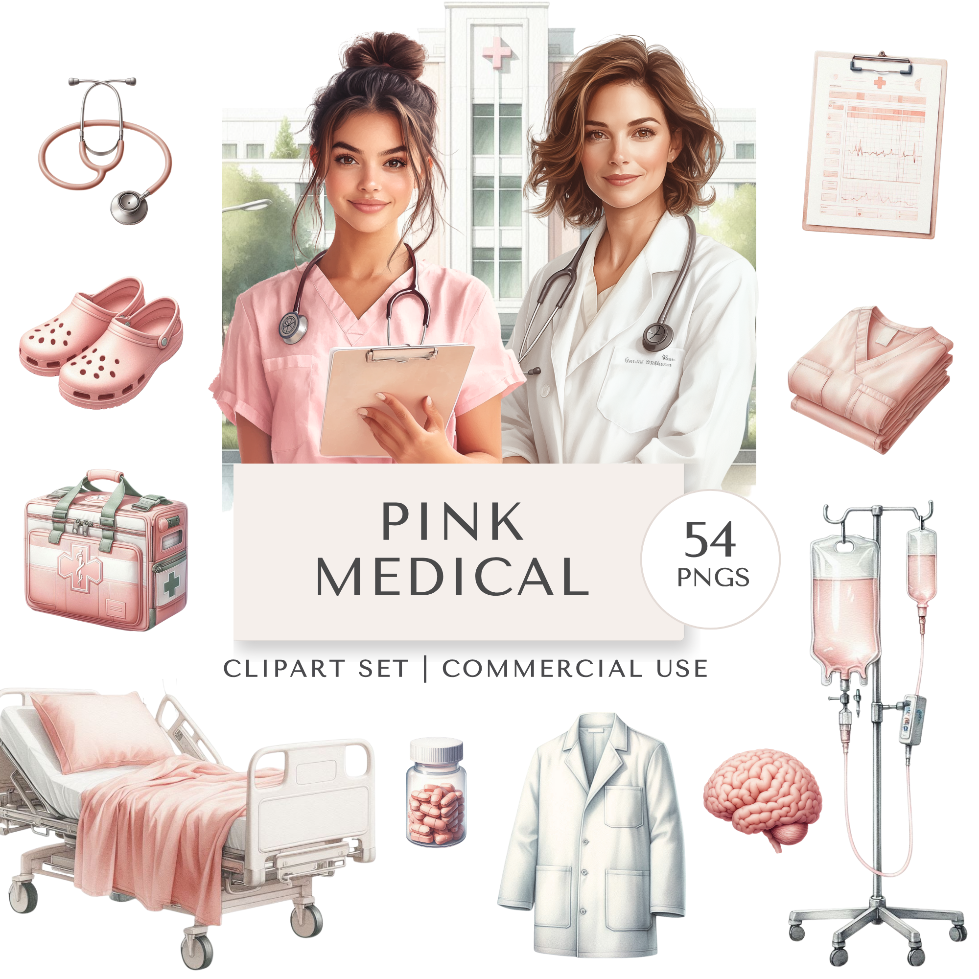This watercolour medical clipart set includes 54 high-resolution PNGs featuring doctors, nurses, paramedics anatomy, hospital equipment, and more in a soft pink colour palette. Ideal for Canva designs, patient education, digital planners, and small business branding. All elements come with transparent backgrounds and include a small commercial license.